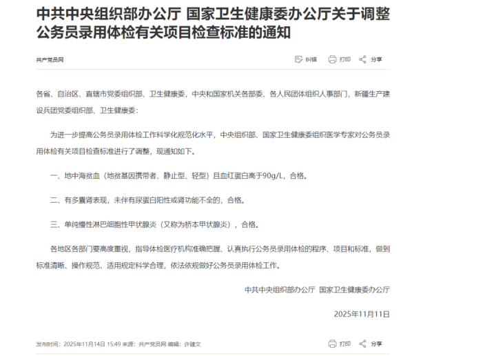 共产党员网11月14日发布《中共中央组织部办公厅国家卫生健康委办公厅关于调整公务员录用体检有关项目检查标准的通知》: